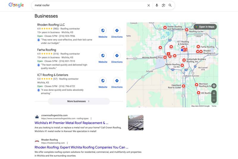 To think about it from a user perspective, if you’re a customer searching for “metal roofer” in Kansas and your search engine shows you a metal roofer in Washington, another roofer in Alabama, and a third in North Carolina, then those results are practically useless to you. However, search engines are smart enough to know that if you’re searching “metal roofer” in Wichita, Kansas, you’re looking only for or primarily for metal roofers in or serving Wichita. Search engines have ways of finding out which searches are likely to have local intent and will favor local results in those searches in order to best serve a searcher’s intent.
